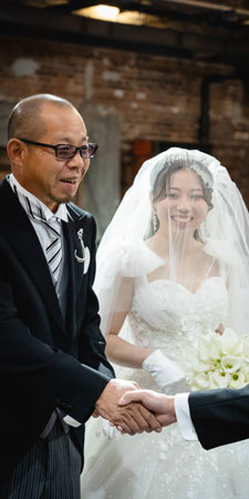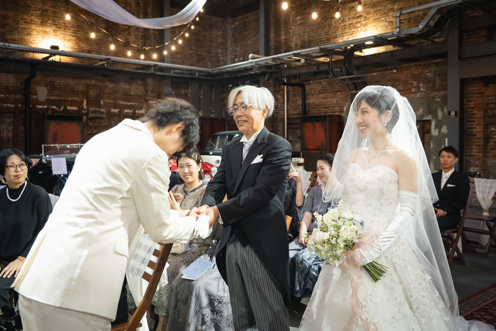 これまでの人生を共に歩んできたお父様の手から、新郎様の手へ。