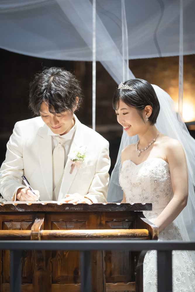 挙式ではダーズンローズやリングボックスセレモニー、ハートドロップスを取り入れた結婚証明書など、