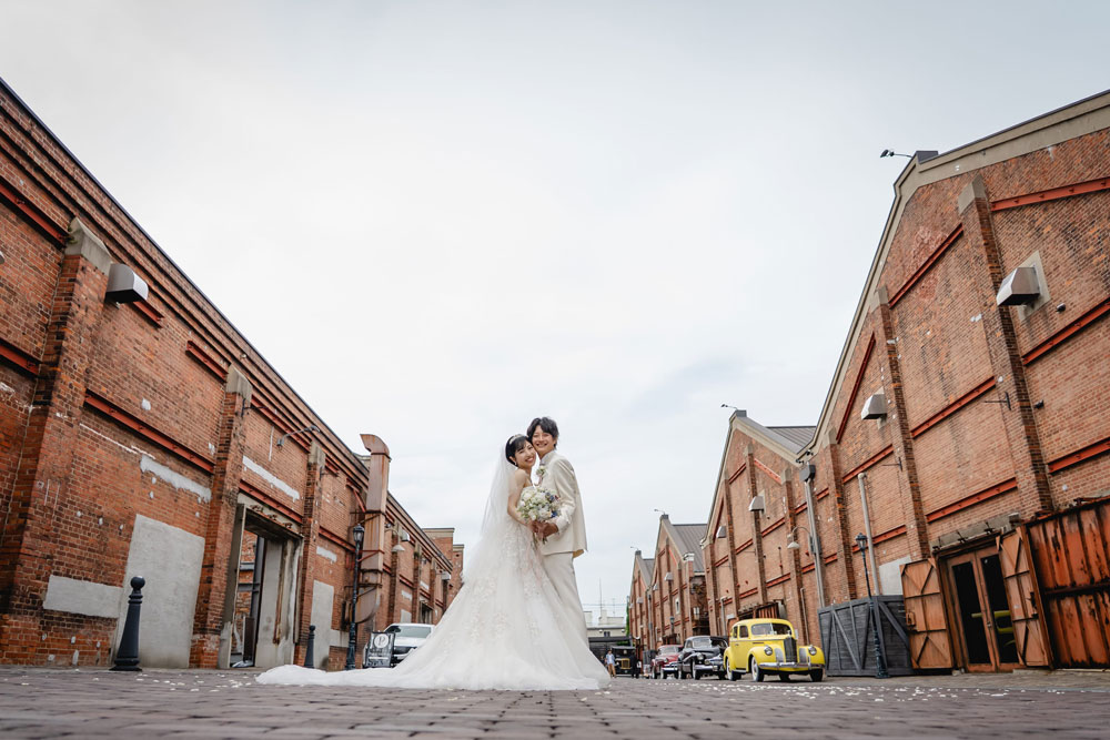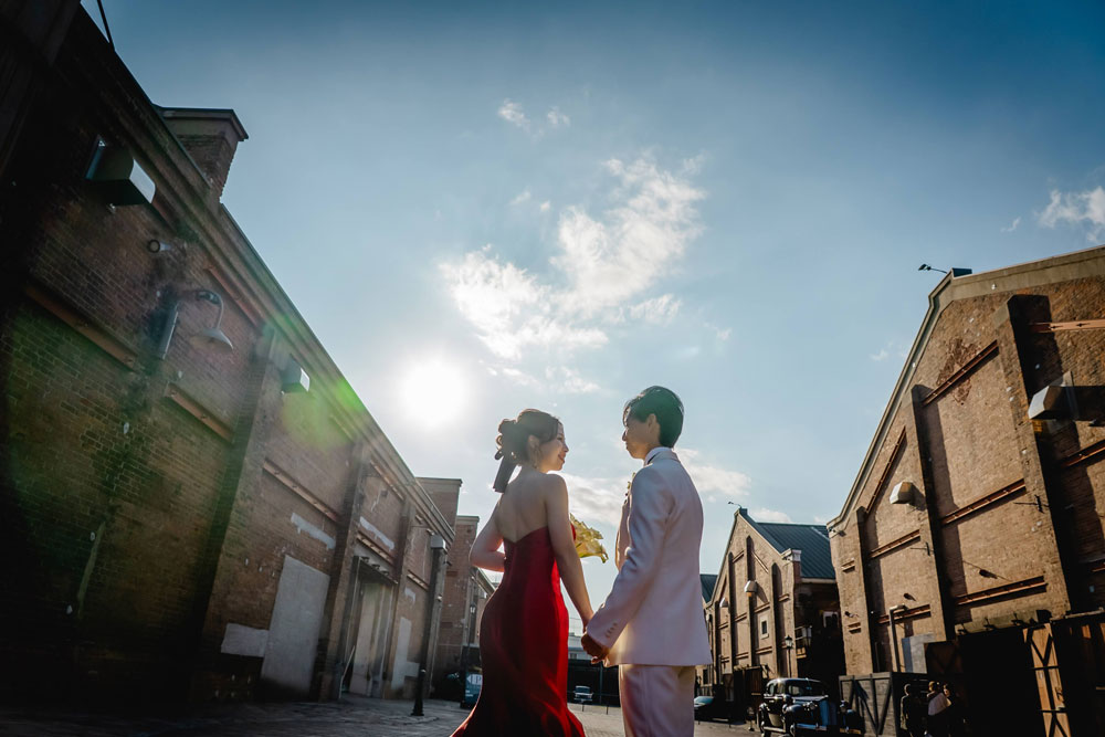 アカレンガのロケーションに綺麗に日が差し、おふたりの結婚を祝福しているような