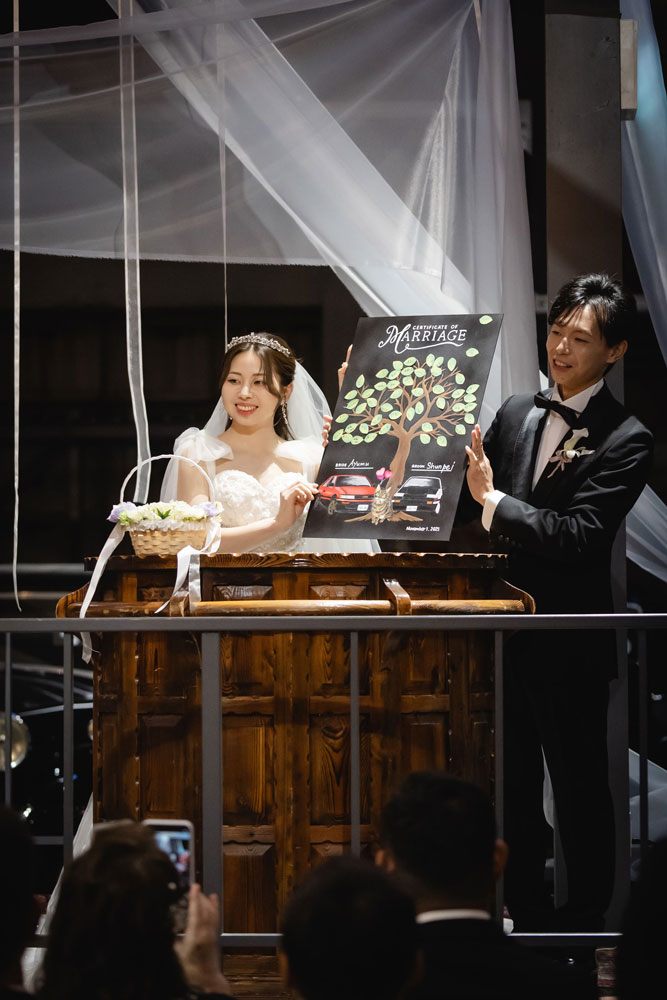ラジコンカーに乗ったオリジナルリングピローや、パネル型の結婚証明書など