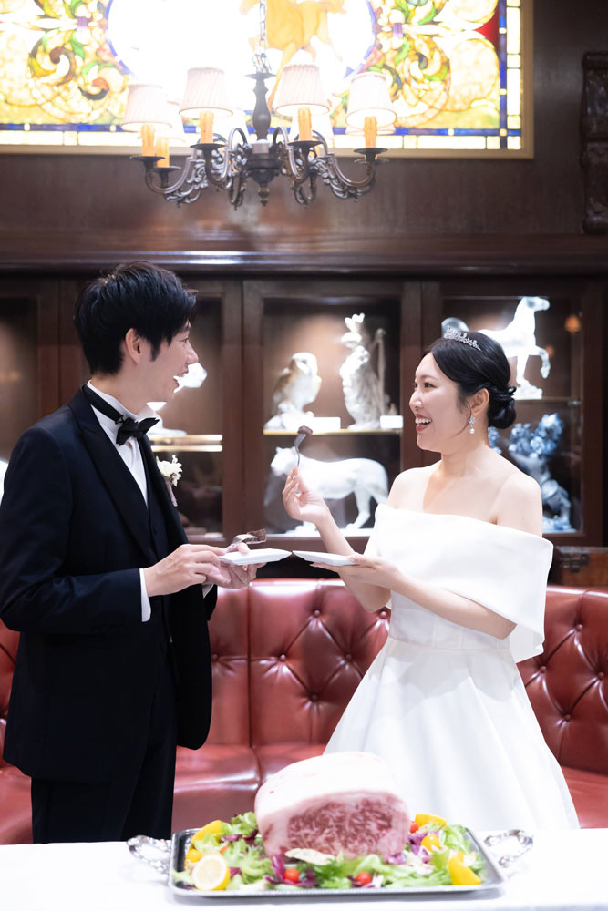 ステーキハウスでの披露宴で人気NO,1演出のお肉入刀&バイトなど、