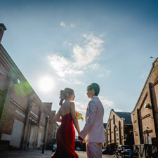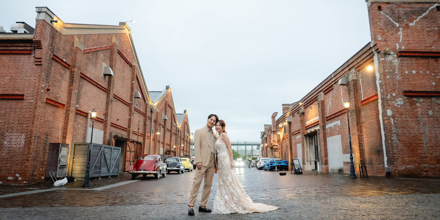 アカレンガのロケーションに綺麗に日が差し、おふたりの結婚を祝福しているような