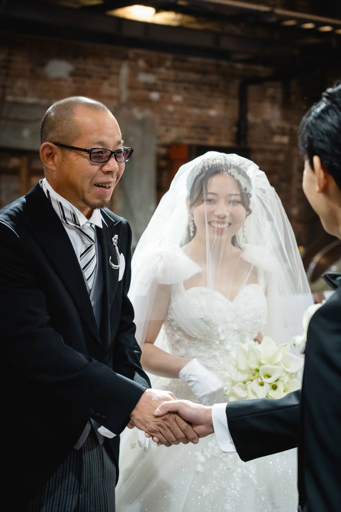 これまでの人生を共に歩んできたお父様の手から、新郎様の手へ。